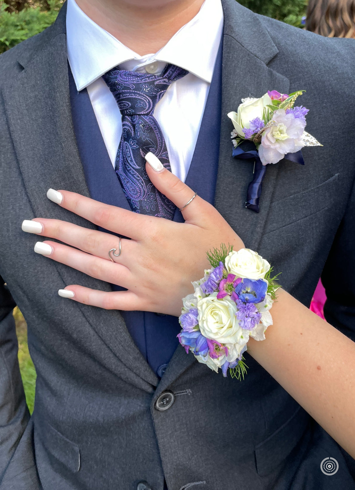 If you are going to an event as a couple, I strongly recommend purchasing a matching set. Things really do pull together well with flowers! Sometimes it is a little tricky coordinating this, because you don't want to mention it and assume that your date is getting you flowers. I get that. I have offered the option of buying a matching set on the site, but another option is for you to buy yours through the site and for your date to also buy theirs through the site and then if you write both your name and the name of your date in the notes section during checkout I will be able to match you up.
