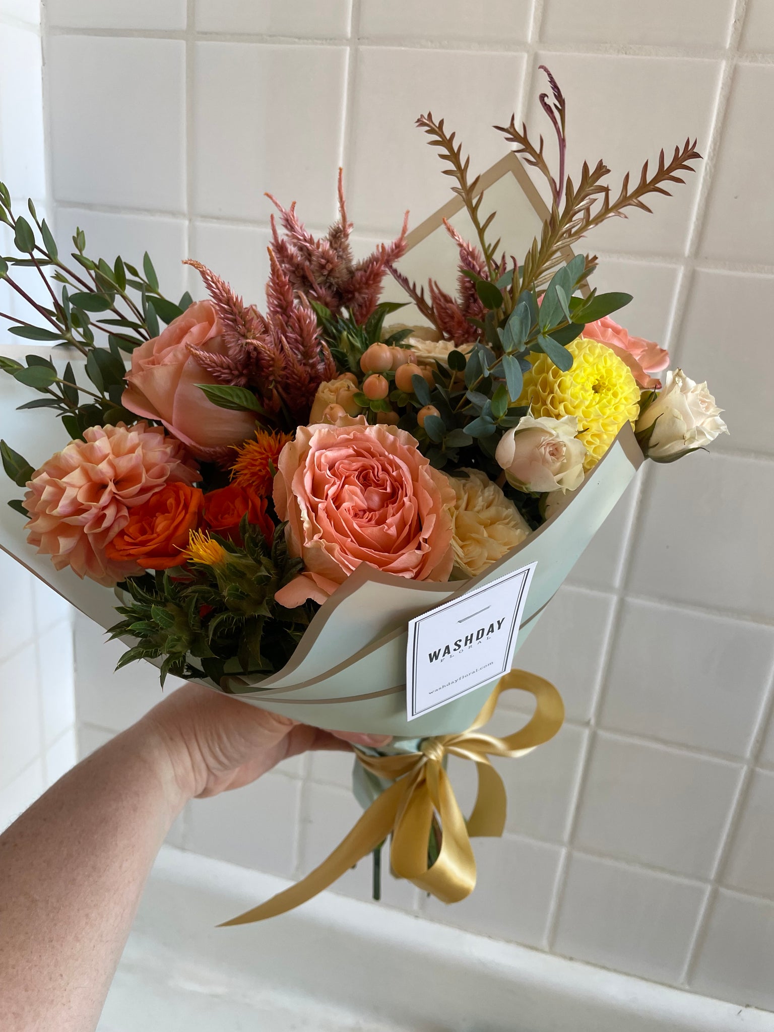 A Washday Bundle is a generous mix of high-quality quality blooms and greens wrapped in paper and tied off with trim and a tag. Although size is consistent, the flowers and colors in each bouquet will vary, making each bunch unique.