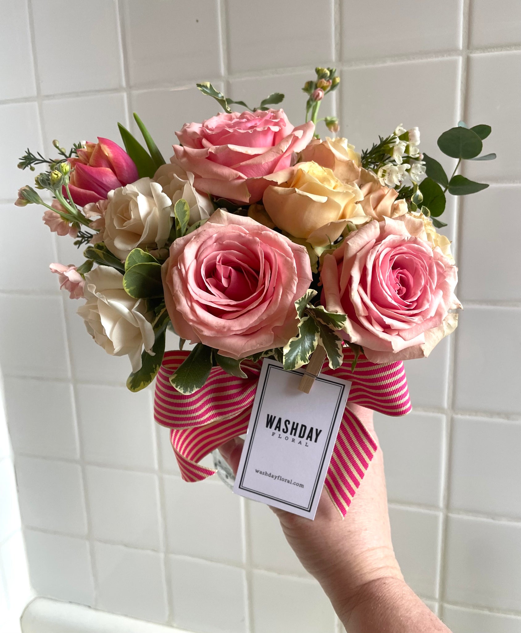 One step up up from Washday's signature Jam Jar, our Double Jam bouquets are everything you love about Jam jars, just twice as big! Tied off with a bit of trim and a tag, the Double Jam Jar Bouquet fills a wide-mouthed pint jar with high end blooms both locally grown and carefully sourced.